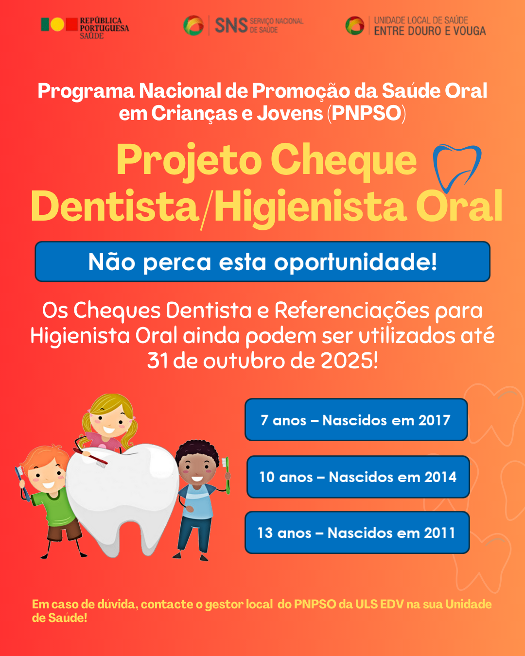 Os cheques dentista referentes ao ano letivo anterior (2024/2025) podem só podem ser utilizados até dia 31 de outubro 2025. Esta é a última oportunidade.
